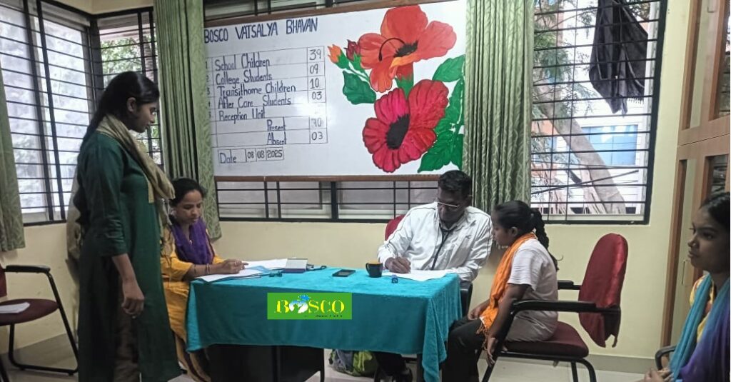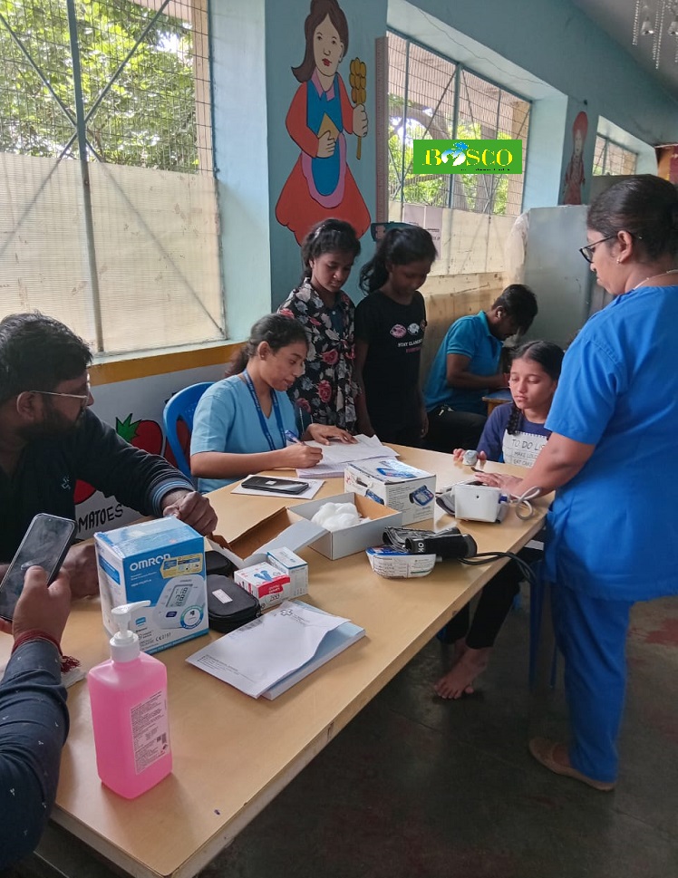 Health check-up camps were conducted for the children of BOSCO Vatsalya Bhavan on August 9 and 16, 2025, by Dr. Abraham and a team from Muthoot Snehashraya Foundation, Eshwar Eye Vision, and Sagar Hospital. The doctor recommended providing the children with protein and iron-rich foods. Comprehensive health assessments, including blood tests, eye check-ups, and general health evaluations (such as blood pressure, blood sugar levels, creatinine, and Hepatitis B), were performed for the girls residing in the centre, vocational training students, and staff members. A total of eighty-nine beneficiaries were served.